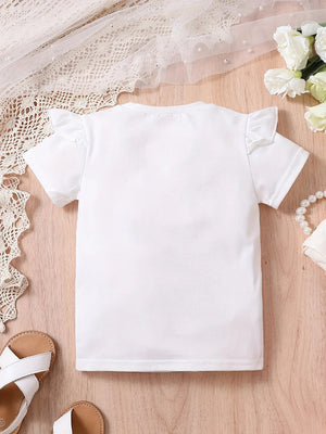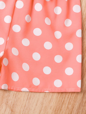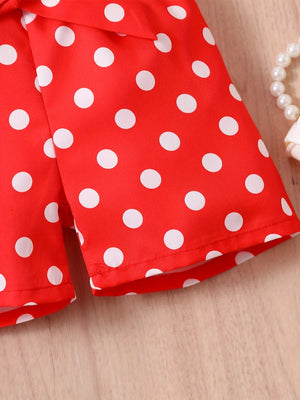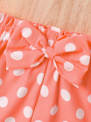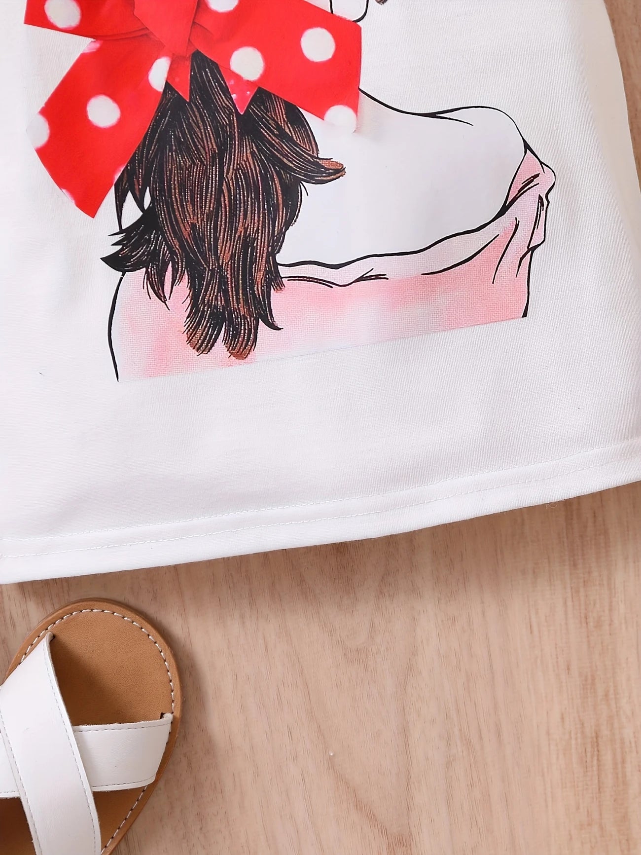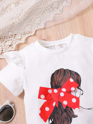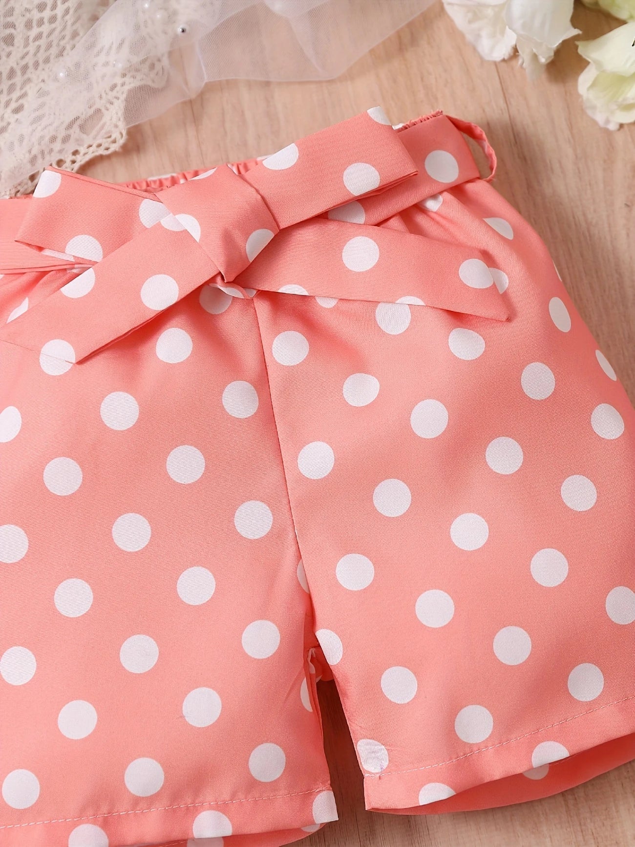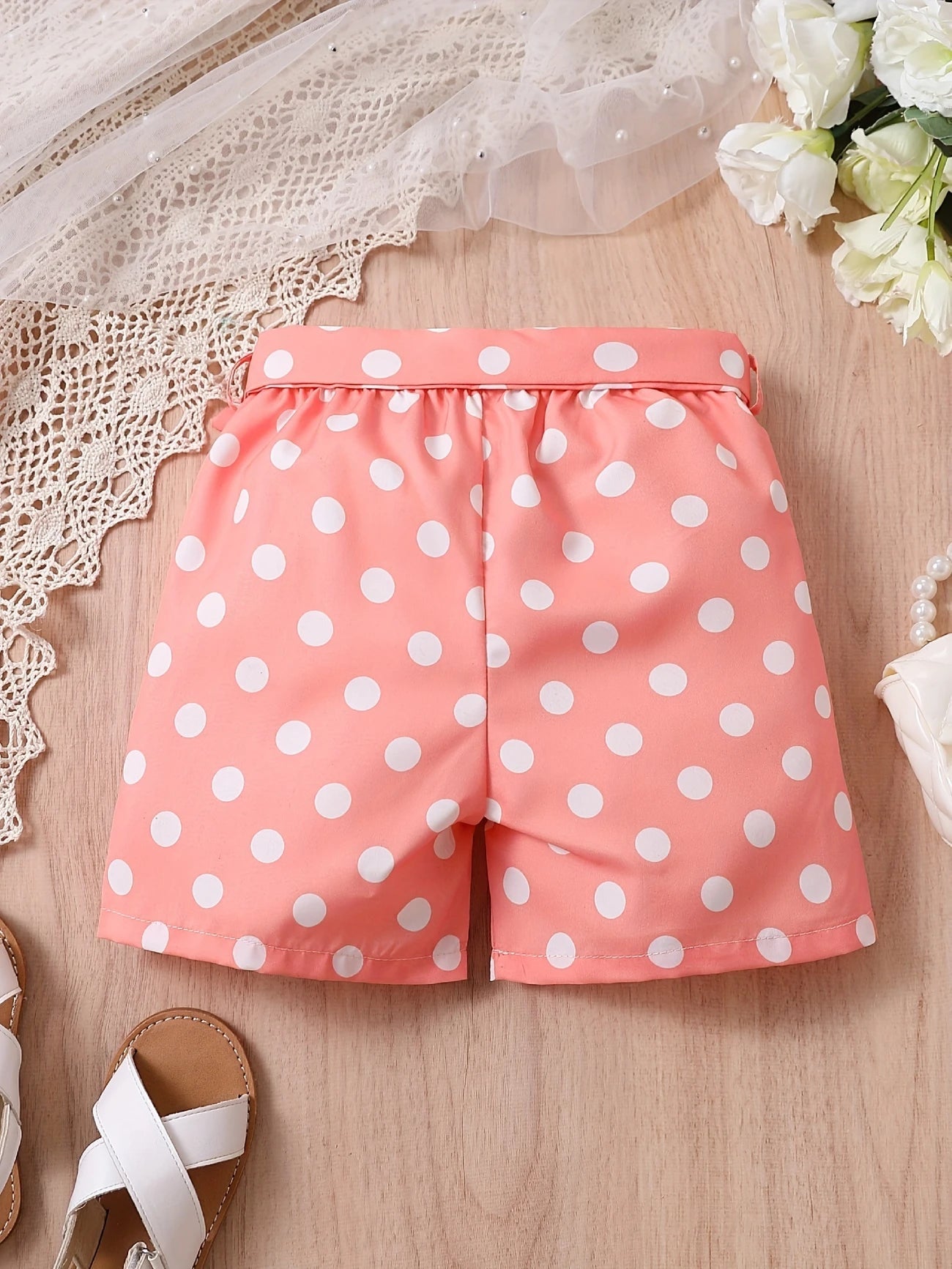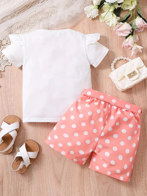 طقم بناتي من قطعتين تيشيرت برسمة ووردة ثلاثية الأبعاد و شورت منقط بتصميم صيفي