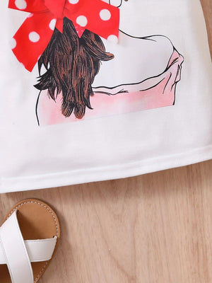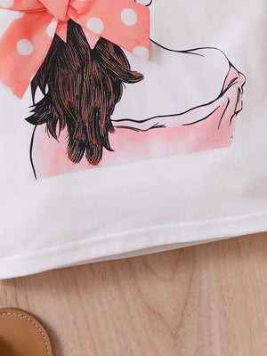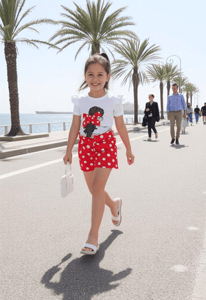 اجعلي صغيرتك تتألق بإطلالة ناعمة ومفعمة بالأنوثة مع هذا الطقم الصيفي المميز! يتميز التيشيرت الأبيض بطبعة فتاة أنيقة مزينة بفيونكة بولكا دوت ثلاثية الأبعاد، ويكتمل الطقم بشورت وردي مزخرف بنقاط بيضاء وربطة جذابة عند الخصر. خامته الخفيفة تجعله مثالياً لأيام الصيف المشمسة والنشاطات اليومية