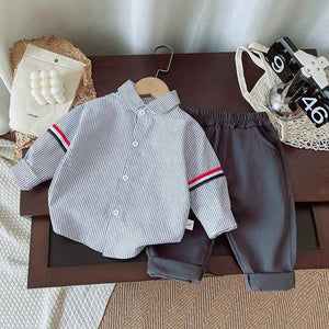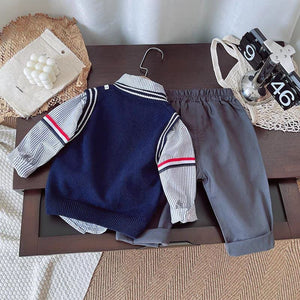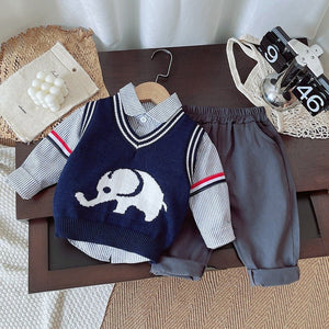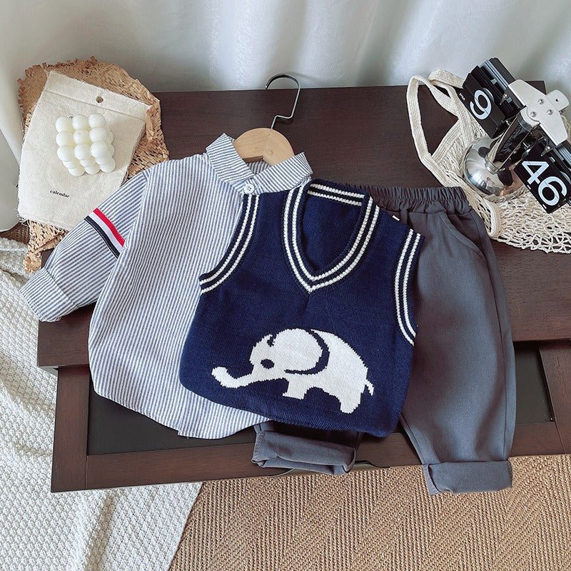 مصمم ليمنح طفلك إطلالة أنيقة بلمسة كلاسيكية، يجمع هذا الطقم بين القميص المخطط والقميص الصوفي بدون أكمام بتصميم فيل لطيف، ليضفي توازناً مثالياً بين الطابع العملي واللمسة الطفولية الراقية.