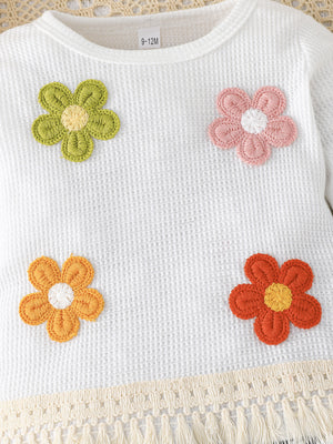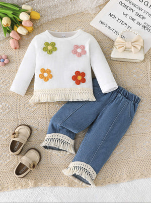 مصمم للحركة اليومية واللمسات العصرية، يمنح هذا الطقم المكون من بلوزة منسوجة وسروال جينز بلمسات شرّابة مميزة إحساسًا بالدفء والأناقة في آنٍ واحد. مصنوع من خامات ناعمة وعالية الجودة، يتيح لطفلتك اللعب بحرية بينما تبدو في كامل أناقتها. الزهور المطرزة تضيف لمسة مرحة، في حين أن تصميم الشرّابات العصرية يعكس روح الأناقة البوهيمية