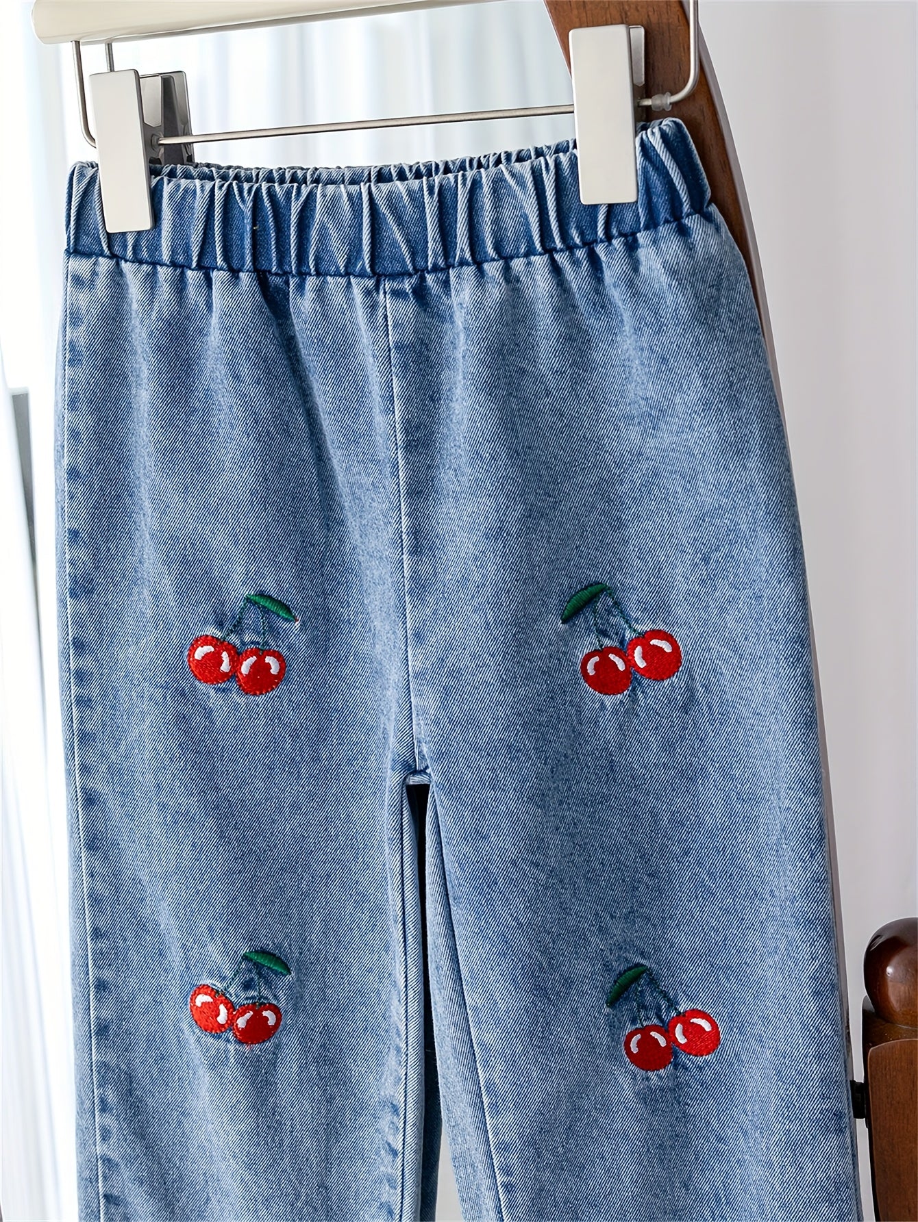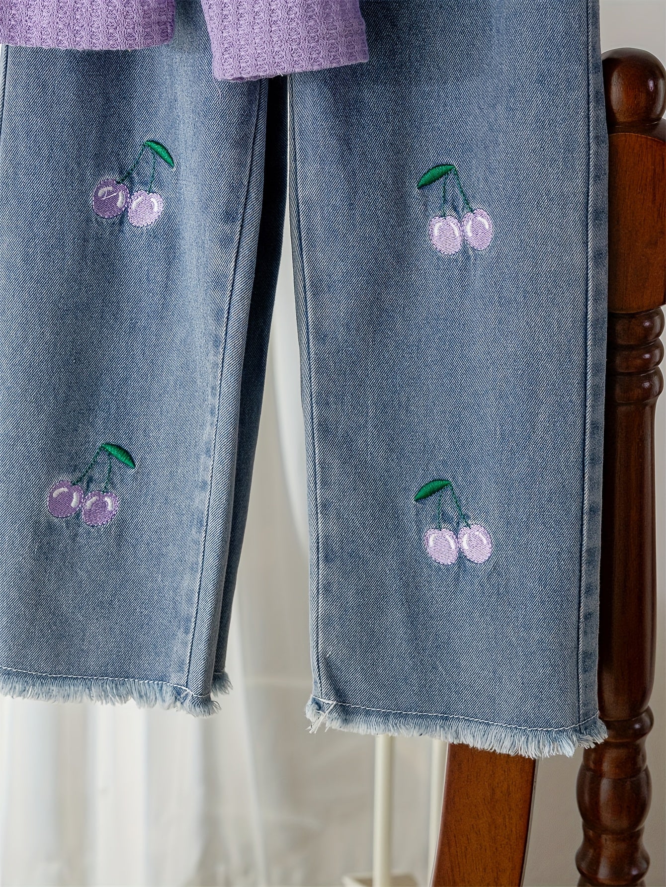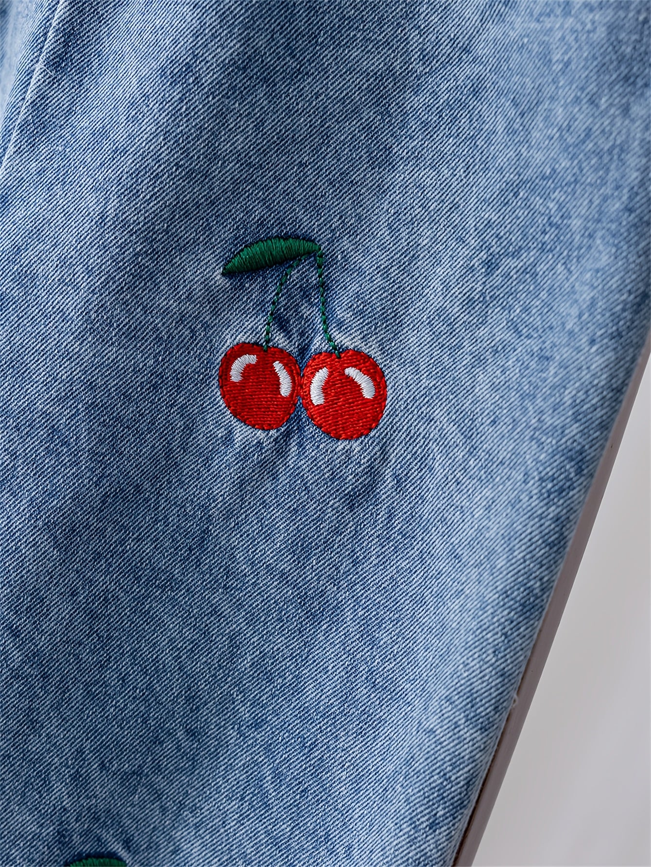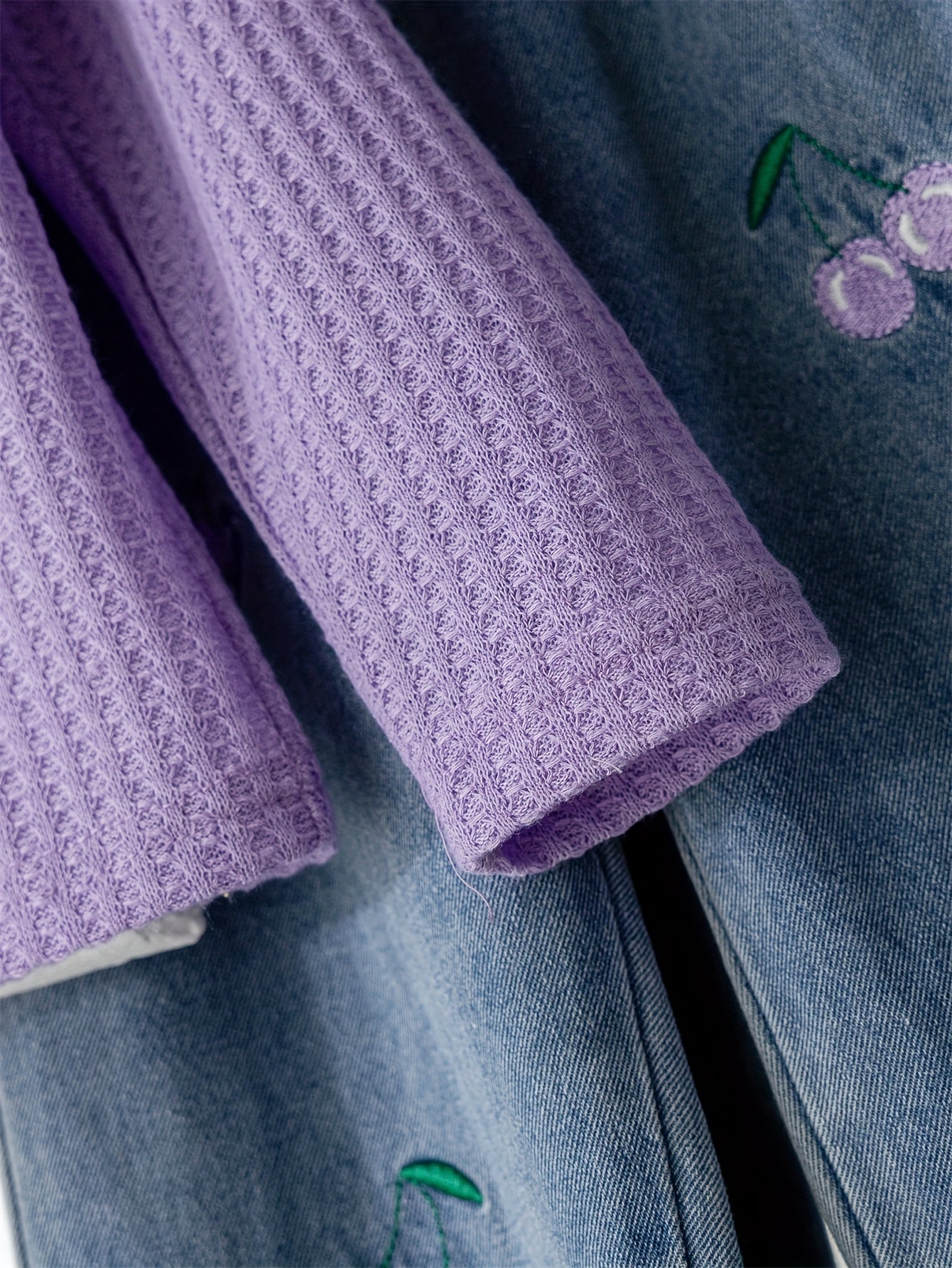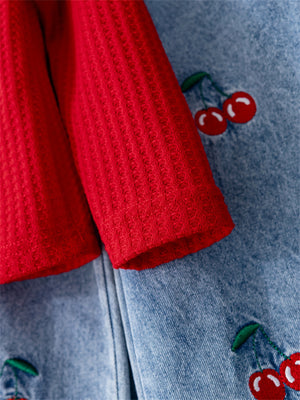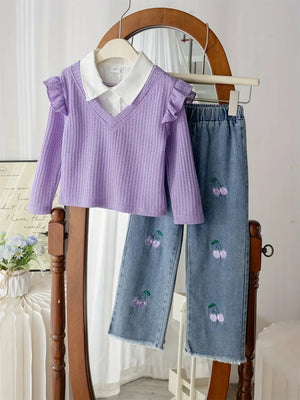 مصمم للحركة والأناقة اليومية، يمنح هذا الطقم العصري الفتيات لمسة من الجمال المرح والراحة الفائقة. الجزء العلوي مصنوع من قماش مضلع ناعم، مزين بياقة قميص بيضاء أنيقة وكشكش على الأكتاف لإطلالة أنثوية مرحة. البنطال الجينز مزين بتطريزات كرز لامعة تضيف لمسة مرحة وعصرية على كل حركة