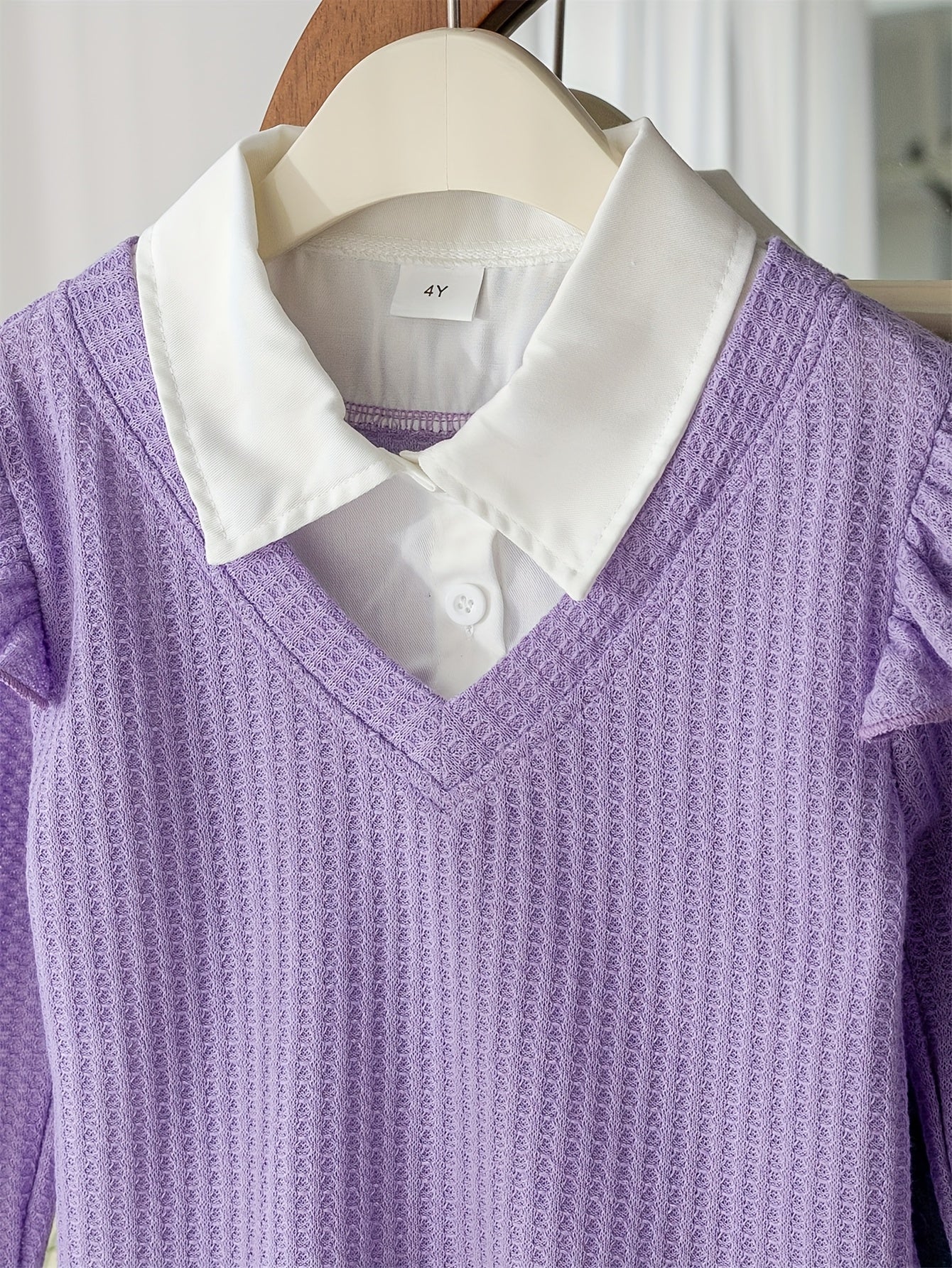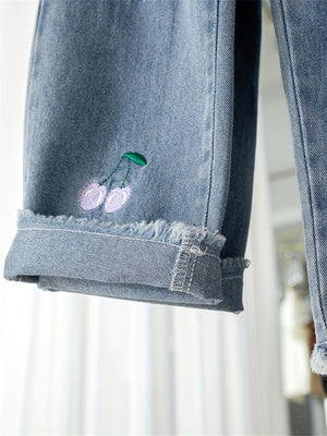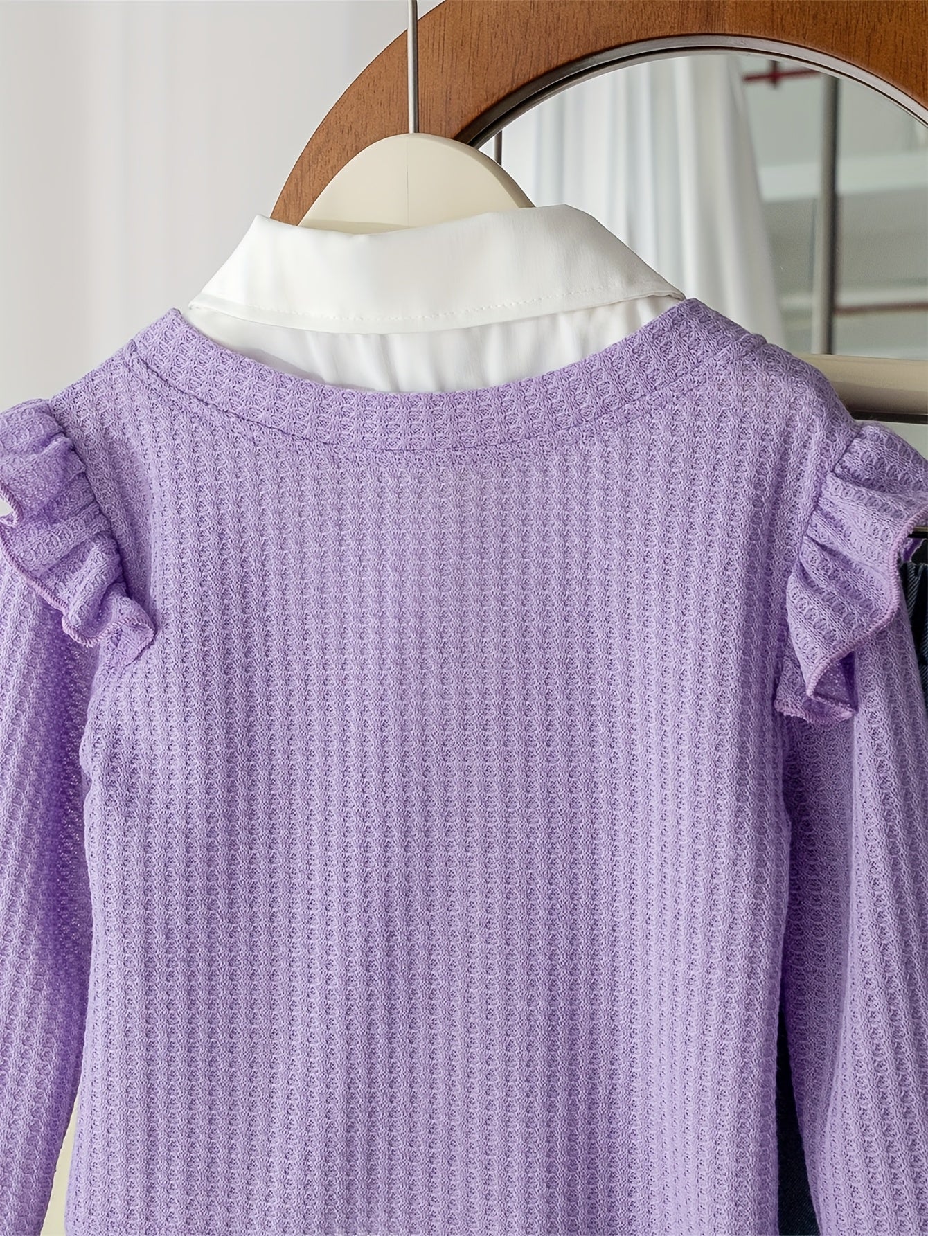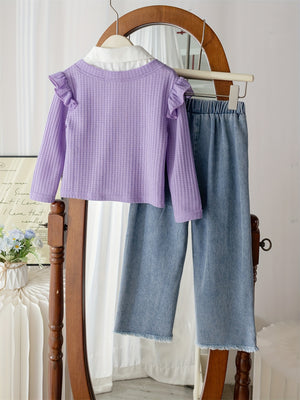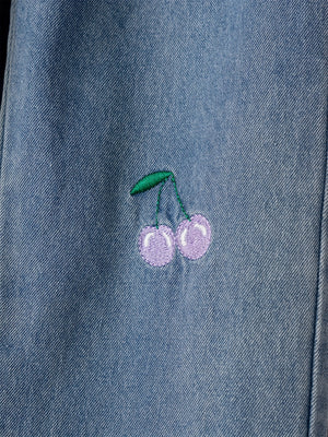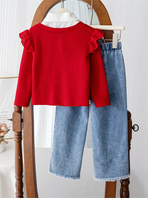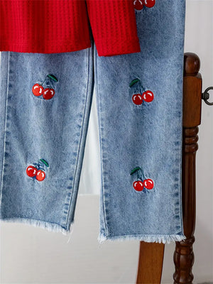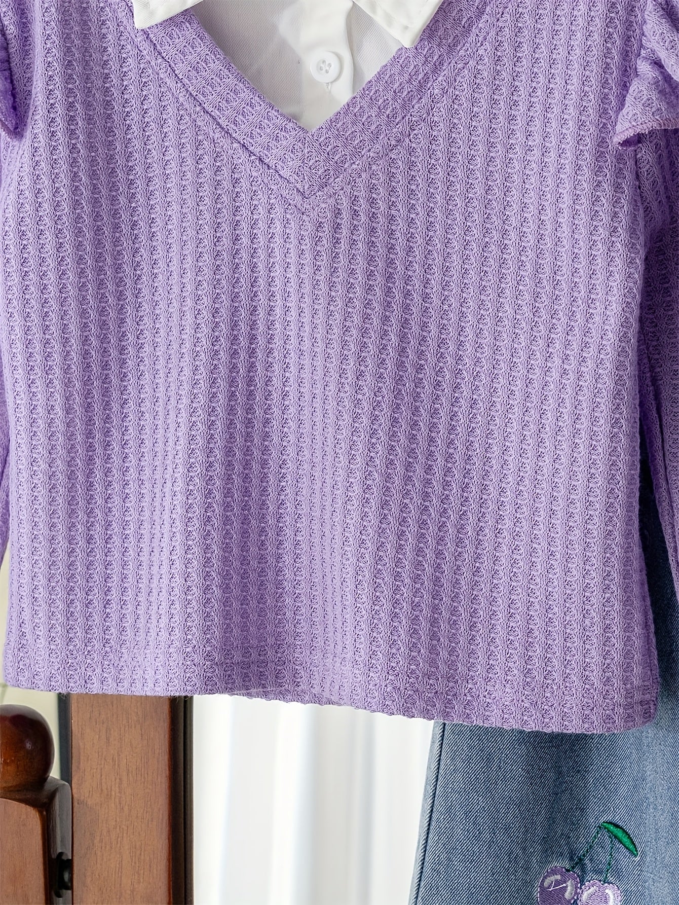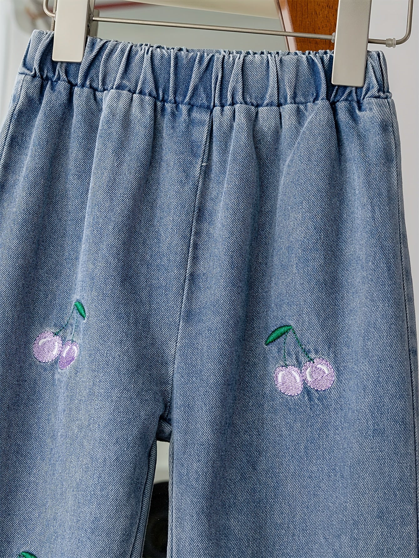 مصمم للحركة والأناقة اليومية، يمنح هذا الطقم العصري الفتيات لمسة من الجمال المرح والراحة الفائقة. الجزء العلوي مصنوع من قماش مضلع ناعم، مزين بياقة قميص بيضاء أنيقة وكشكش على الأكتاف لإطلالة أنثوية مرحة. البنطال الجينز مزين بتطريزات كرز لامعة تضيف لمسة مرحة وعصرية على كل حركة