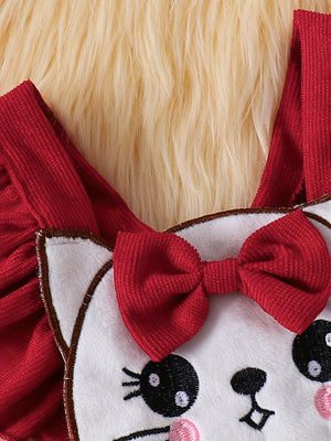 يأتي التطريز على شكل قطة لطيفة مع فيونكة حمراء ليمنح الإطلالة لمسة محببة تجذب الأنظار. كما تتكامل القطعة مع ربطة شعر مطابقة لتكتمل الإطلالة بأناقة لا تُقاوم