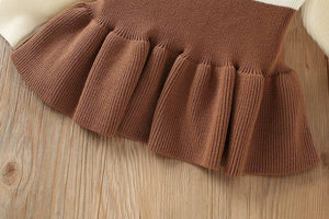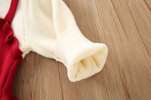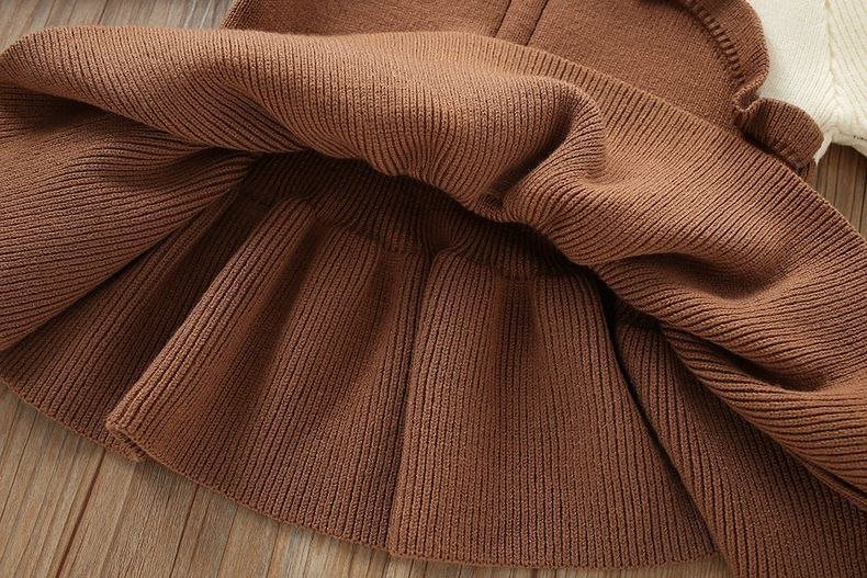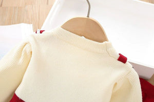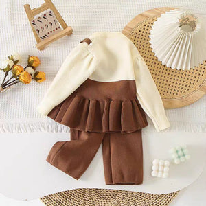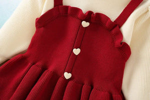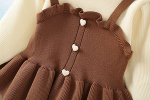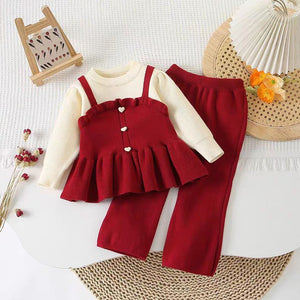 يتميز هذا الطقم البناتي بتصميم ثلاثي أنيق يجمع بين بلوزة بيج ناعمة بدون خياطة بارزة، وفستان بحمّالات بلمسة كروشيه وبأزرار على شكل قلوب، وبنطال مطاطي مريح. مناسب للمناسبات والخروجات وحتى الصور الجميلة، مع خامة دافئة ومريحة لموسم الخريف والشتاء
