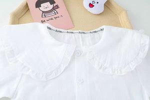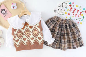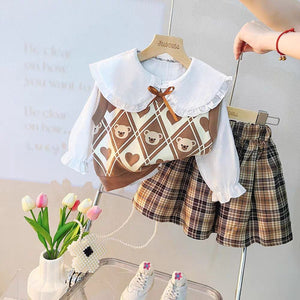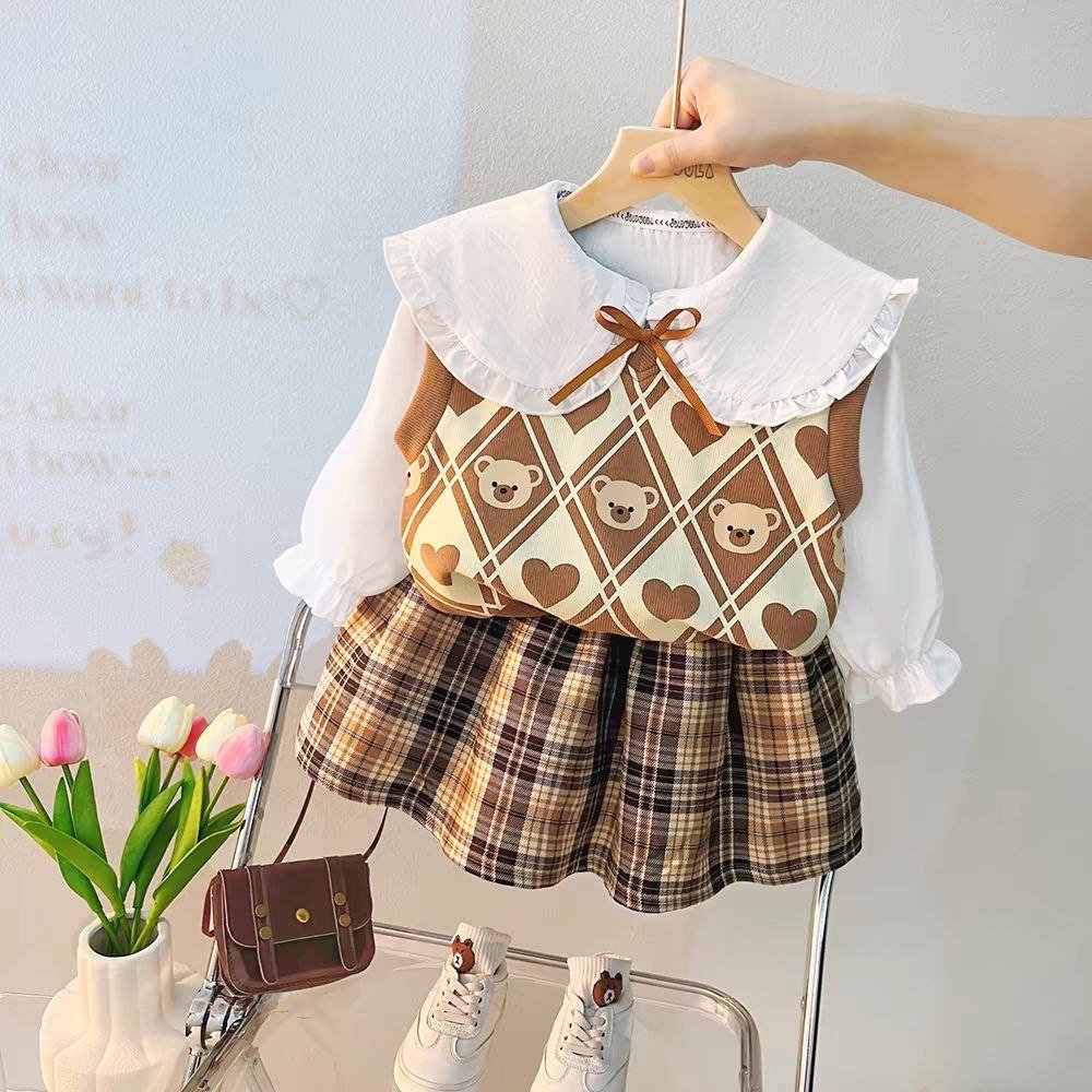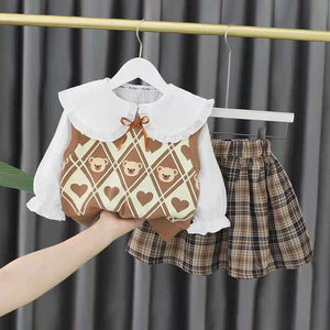مصمم ليمنح طفلتك إطلالة دافئة وناعمة بروح طفولية محببة، يأتي هذا الطقم البناتي بثلاث قطع متناغمة تجمع بين الأناقة والراحة في تفاصيل واحدة. البلوزة القطنية بياقتها العريضة المزينة بالكشكشة تضيف لمسة راقية وكلاسيكية، بينما تمنح السترة بنقشة الدب القماشي لمسة مرحة تعكس براءة الطفولة.
