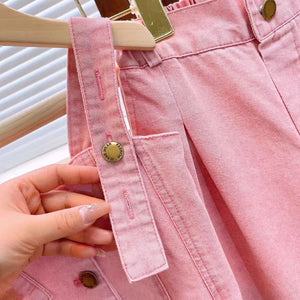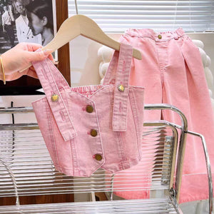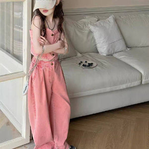 طقم جينز بناتي أنيق مكون من بلوزة بدون أكمام وبنطال واسع