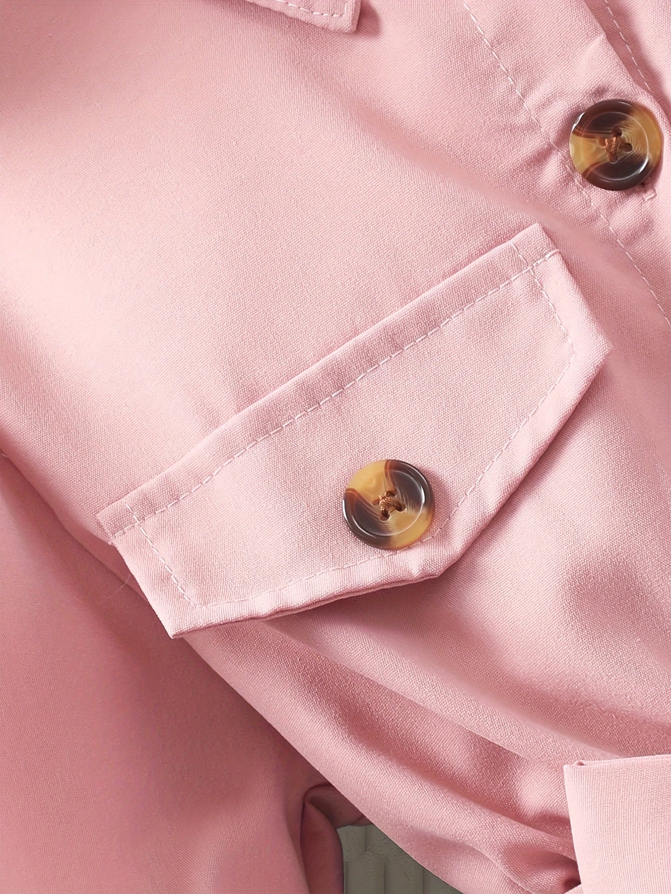 يأتي بتصميم ياقة كلاسيكية وأزرار أمامية تضيف لمسة من التوازن بين العملية والأناقة، مما يجعله خيارًا مثاليًا للخروجات الرسمية أو جلسات التصوير الربيعية