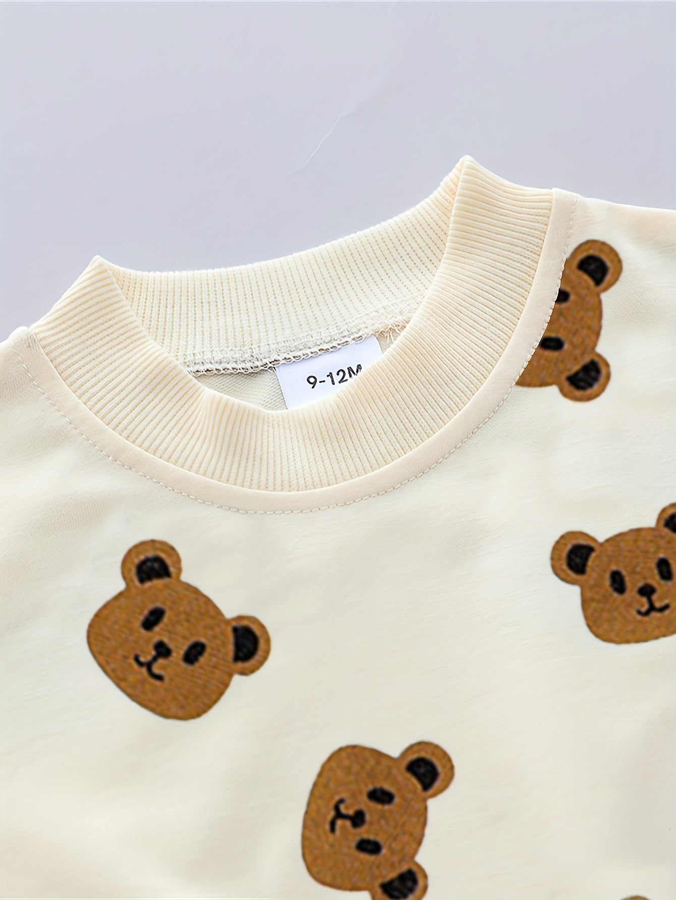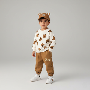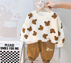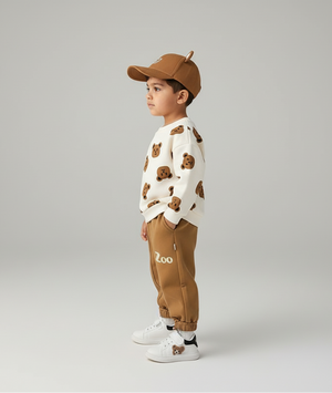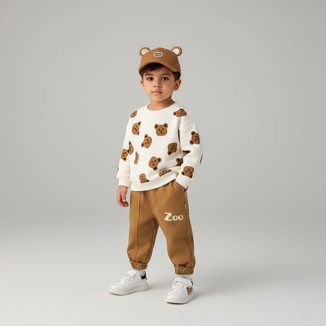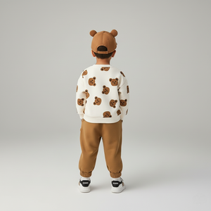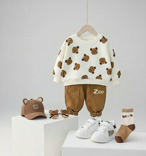 يُضيف هذا الطقم الرائع لمسة دفء ومرح لإطلالة طفلك اليومية بفضل طبعات الدب اللطيفة المنتشرة على البلوزة، مع تنسيق مثالي بين الألوان الكريمية والبني الدافئ. صُمّم الطقم ليمنح طفلك راحة قصوى أثناء اللعب، مع خامات ناعمة ووزن خفيف يناسب الخروجات اليومية والروضة.