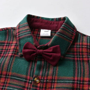 قميص صوفي بنقشة الكاروه العصرية بلون أخضر نبيذي فاخر، يتناسق مع بنطال بوردو أنيق مزود بحمالات قابلة للتعديل لمظهر مرتب وثابت طوال اليوم. اللمسة النهائية تأتي مع بابيون جذاب تضيف طابع المناسبات الراقية والأجواء الاحتفالية.