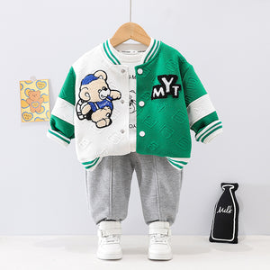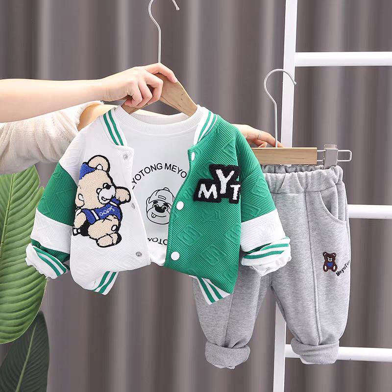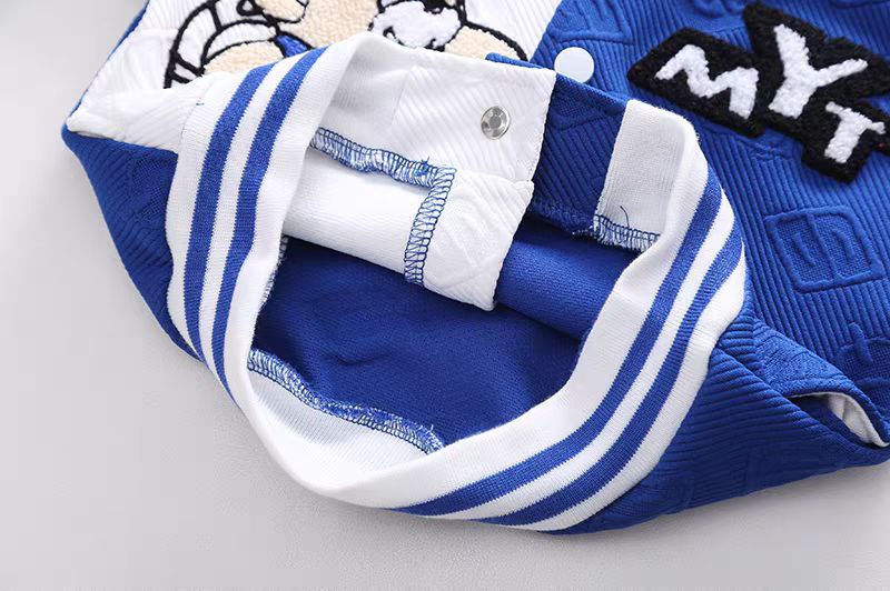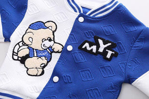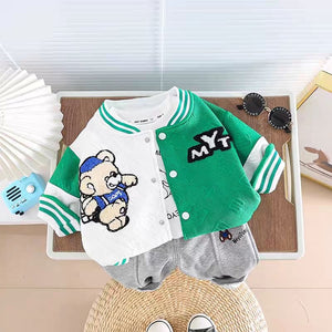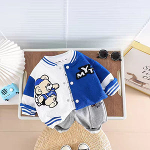 دع طفلك الصغير يتألق بأناقة وراحة مع طقم الدب 'MYT'، المصمم للعب والتعلم والمغامرات طوال اليوم. تتكون هذه المجموعة من ثلاث قطع: جاكيت رياضي على طراز الجامعات (Varsity) مصنوع من نسيج محبوك ومسامي وذو ملمس خاص لسهولة الحركة، مع تي شيرت قطني ناعم وبنطلون رياضي مريح (Joggers). إنه مصمم ليواكب طاقة طفلك النشيط مع مظهر متناسق ومبهج.