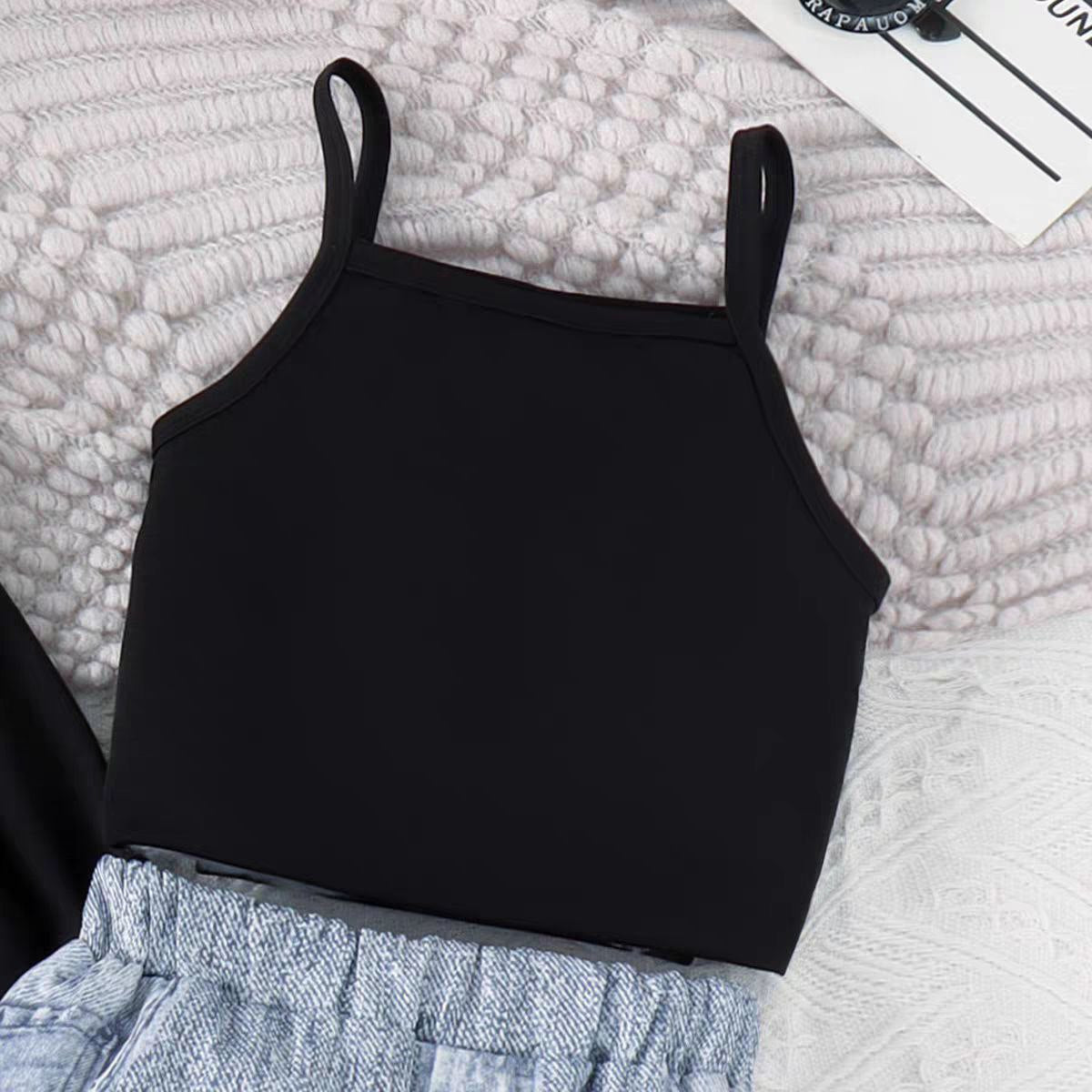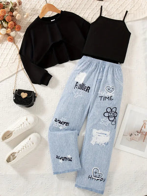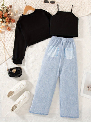 طقم بناتي 3 قطع كروب توب، جاكيت بوليرو وبنطلون جينز