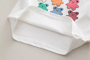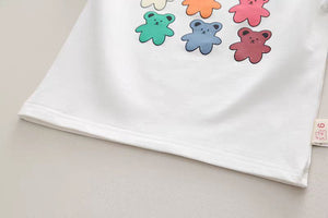 التيشيرت: أبيض بأكمام ملونة (وردي، أزرق، بنفسجي).