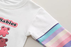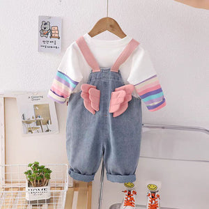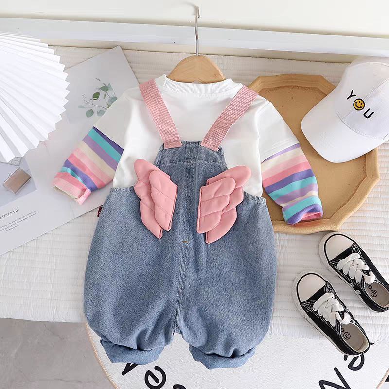 التيشيرت مصنوع من قطن ناعم وعالي الجودة بأكمام قصيرة مزينة بخطوط قوس قزح بألوان زاهية تلفت الأنظار، بينما تضيف سالوبيت الجينز بطياتها الأنيقة وجناحيها الخلفيين المصنوعين من القماش الوردي لمسة خيالية تُحبها الصغيرات.