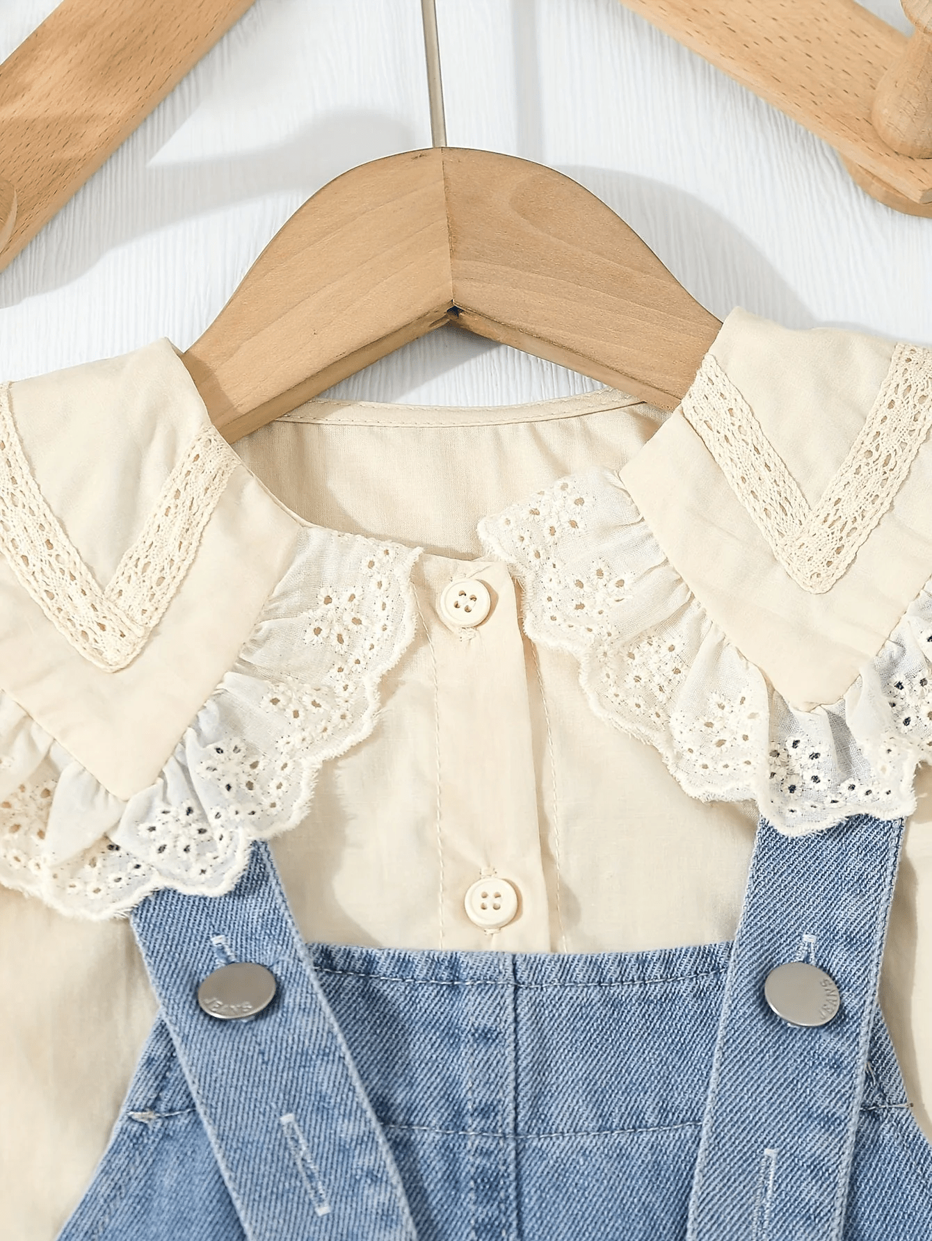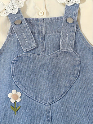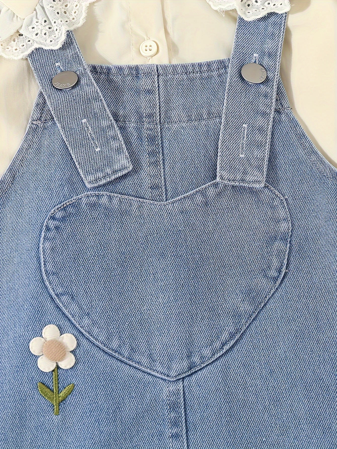 مصمم ليمنح طفلتك إطلالة أنثوية ناعمة تجمع بين الرقيّ والبساطة، يأتي هذا الطقم الجميل بدمجٍ متناغم بين قميص قطني بتفاصيل دانتيل رومانسية على الياقة، وفستان جينز بحمّالات مزيّن بزهور مطرّزة تمنح لمسة طفولية مبهجة.
