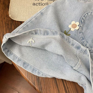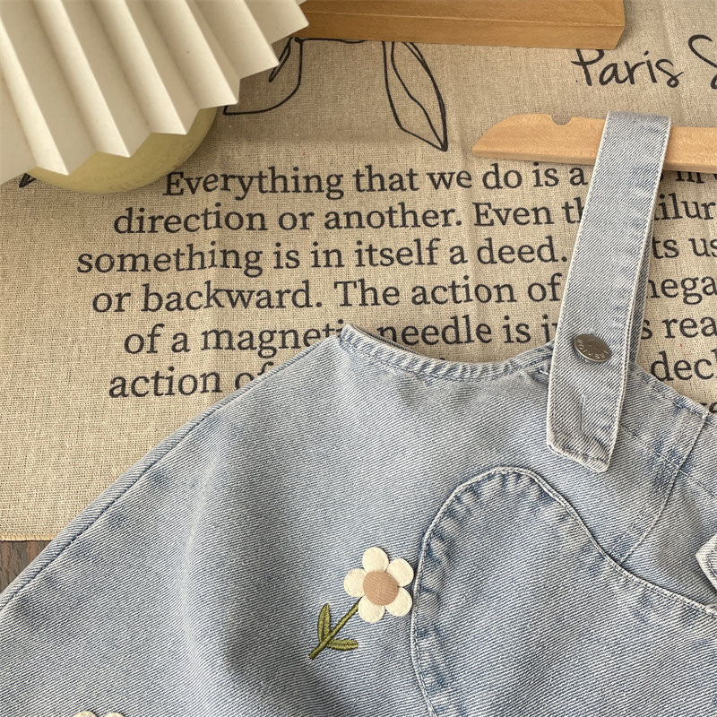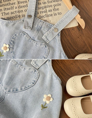 فستان جينز بتطريزات زهرية لطيفة ولمسة قلب على الواجهة