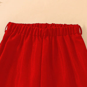 خصر البنطال مزين بفيونكة أمامية تضيف لمسة أنثوية ناعمة.