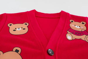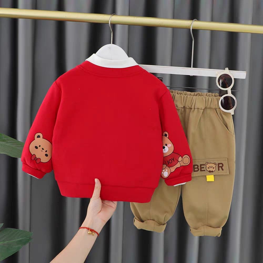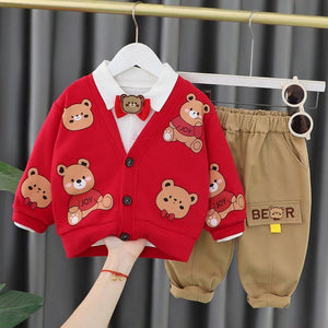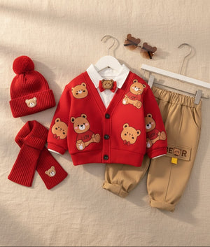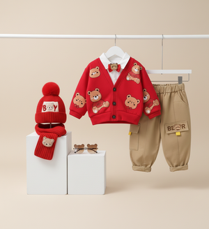 هذا الطقم الساحر يجمع بين الأناقة الطفولية والدفء المثالي لأيام الشتاء. يتميّز الجاكيت الأحمر برسومات الدب المحبوبة التي تمنح طفلك إطلالة مرحة، بينما يضيف القميص الأبيض وربطة العنق لمسة رسمية ساحرة. أما البنطال المريح فيقدّم حرية حركة ممتازة طوال اليوم. مع الطاقية والوشاح المتناسقين، يصبح الطقم كاملًا لإطلالة شتوية دافئة ومبهجة.