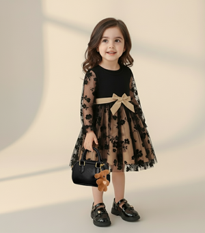 يمنح هذا الفستان طفلتك إطلالة راقية تجمع بين الفخامة والنعومة، بفضل تصميمه الأنيق الذي يجمع بين التول الأسود المطرّز والطبقة السفلية بلون الشمبانيا الهادئ. تأتي العقدة الذهبية في الخصر كلمسة نهائية تضيف سحرًا ملكيًا وتبرز جمال القصة. قطعة مثالية للمناسبات، الحفلات، والتقاط الصور المميّزة.