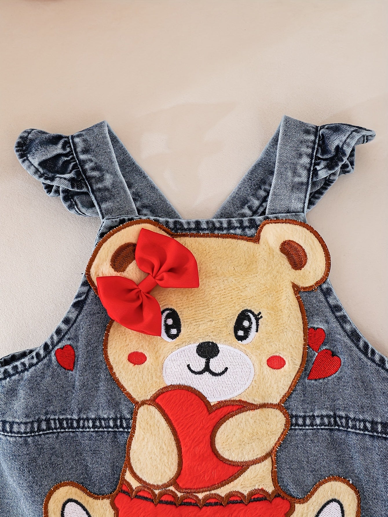 صُمم هذا الطقم ليمنح صغيرتك إطلالة مفعمة بالدفء والمرح. يتميز بجمبسوت جينز ناعم بلمسة كلاسيكية مزين بتطريز دبدوب لطيف يحمل قلبًا أحمر، ما يضيف روح الطفولة البريئة ولمسة حب إلى الإطلالة.