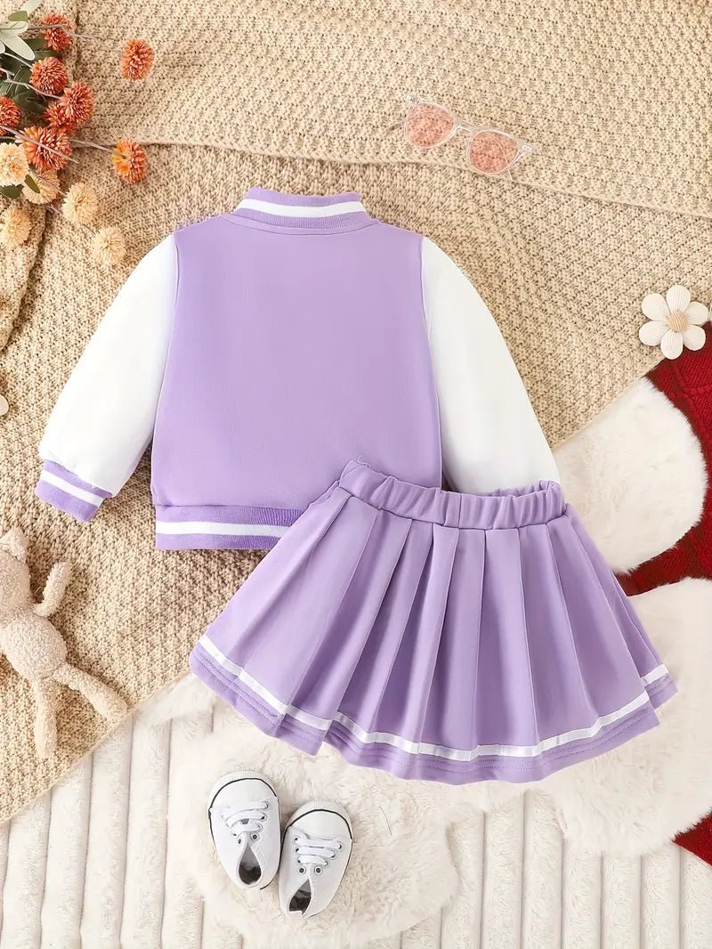 مصمم ليمنح طفلتك مظهراً أنيقاً ومفعماً بالطاقة العصرية، يأتي هذا الطقم البناتي بقصة كاجوال راقية مستوحاة من موضة الـ varsity الأمريكية بلمسة طفولية ناعمة.