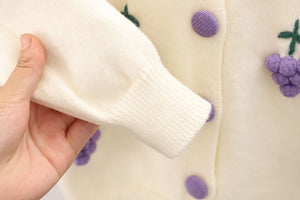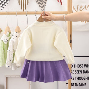 صُمم هذا الطقم البناتي الرائع ليوفّر الدفء والراحة خلال موسم الخريف والشتاء، مع لمسات من الأناقة الطفولية المرحة. يتميز بجاكيت صوفي ناعم بتفاصيل تطريز بارزة لفواكه ملونة (فراولة أو عنب) تضيف لمسة حيوية ساحرة، مع أزرار أمامية مطابقة للون الفاكهة لمظهر متناسق. التنورة المنسّقة مصنوعة من قماش سميك ومريح بطيّات واسعة تمنح الطفلة حرية الحركة وإطلالة مميزة