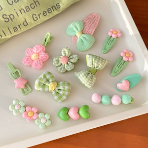 أضيفي لمسة ربيعية ناعمة لتسريحة صغيرتك مع طقم مشابك الشعر الأخضر والوردي الساحر! يتميز بتصاميم فيونكات وقلوب وزهور بألوان باستيل لطيفة وملمس ناعم. مثالي للإطلالات اليومية، أعياد الميلاد أو اللعب التنكري، ويعد الإضافة المفضلة لكل فتاة صغيرة